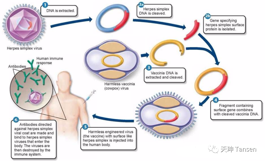 重組病毒載體疫苗:將病毒負責誘導和成免疫原性蛋白質/亞單位的基因片段找出來,然后嫁接到某種我們熟知的、沒有致病性或者致病性極微弱的病毒(例如腺病毒)上。探后利用載體病毒帶著基因片段進入人體細胞,大量合成可以誘導免疫應答的蛋白質/亞單位。這就等于綜合了減毒活疫苗和亞單位疫苗的優勢,又避免了各自的短板。
